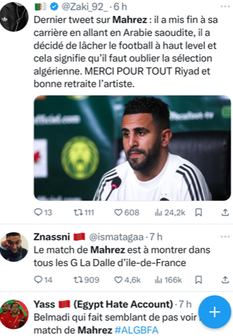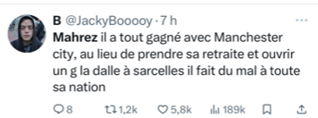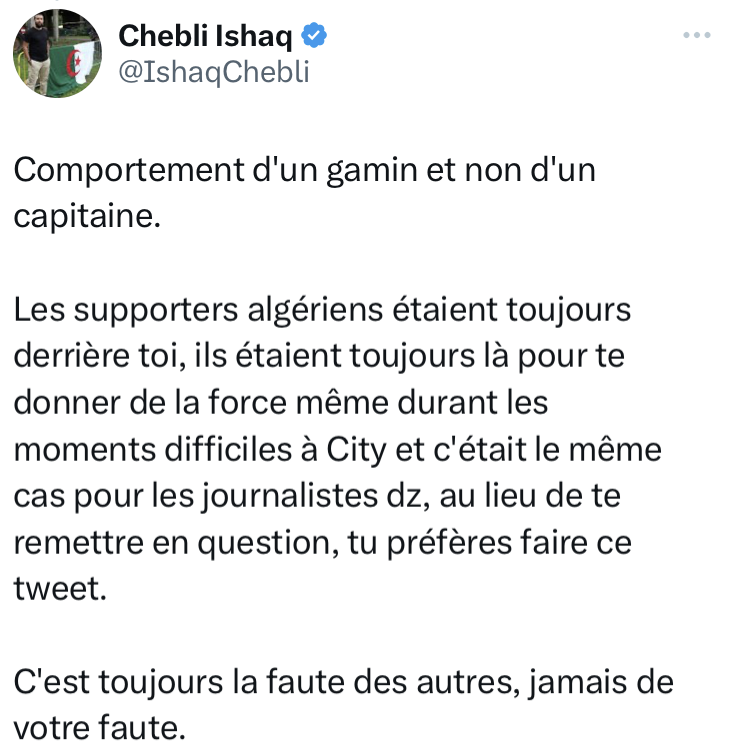 À lireHakimi blessé : drame national au MarocDes déclarations qui ne manquent pas de faire beaucoup parler sur les réseaux sociaux. « Comportement d’un gamin et non d’un capitaine », résume ce supporter sur X. « Les supporters algériens étaient toujours derrière toi, ils étaient toujours là pour te donner de la force même durant les moments difficiles à City … C’est toujours la faute des autres, jamais de votre faute ».