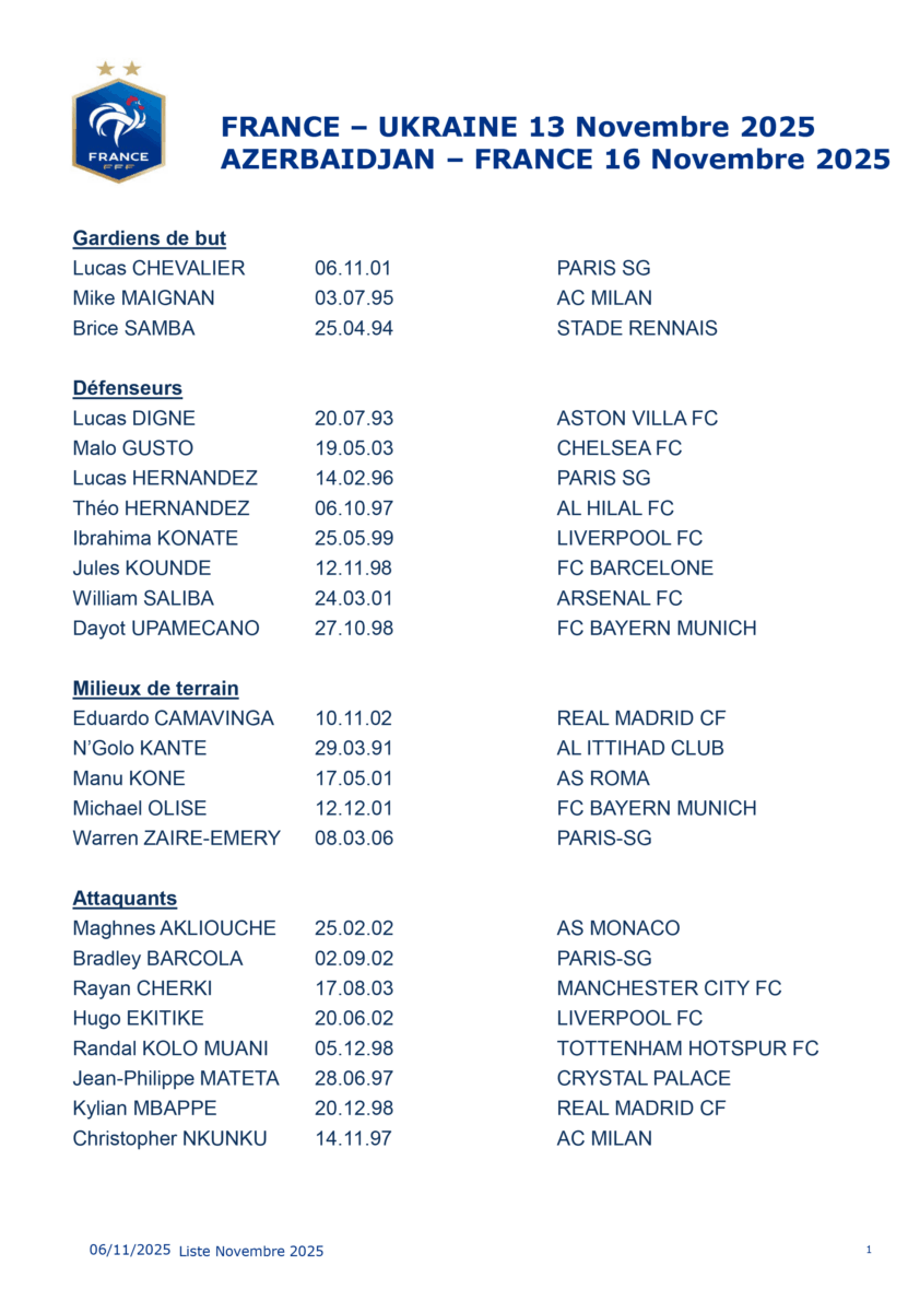 Privé d’Adrien Rabiot et d’Aurélie Tchouaméni pour les matchs contre l’Ukraine et l’Azerbaïdjan (13 et 16 novembre), Didier Deschamps a logiquement rappelé Warren Zaïre-Emery chez les A. Lors du dernier rassemblement, le titi parisien avait été relégué chez les Espoirs, un retour au source qu’il lui a fait le plus grand bien. Redevenu titulaire au PSG, le joueur de 19 ans a enchainé les bonnes performances au milieu de terrain, ce qui prédisait un retour avec les A.