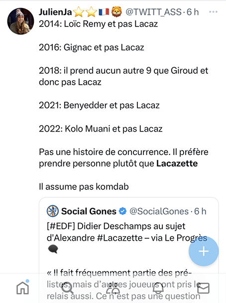 Quelque soit les époques, et les concurrents potentiels, les choix de Didier Deschamps laissent quand même songeurs, comme le décrypte sur X ce supporters de l’OL qui précise : « Didier Deschamps préfère personne à Lacazette ».