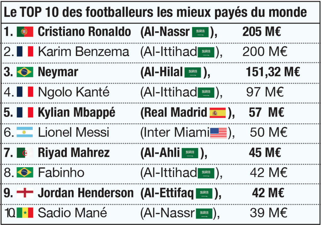 Tout juste transféré au Real Madrid, Kylian Mbappé arrive en 5ème position, avec des gains de 57 M € annuels. A noter que ces chiffres correspondent au cumul de la rémunération donnée par les clubs, des primes négociées, des sponsors et des activités entrepreneuriales des joueurs et entraîneurs de football. A noter que l’on trouve trois joueurs français (Benzema, Kante et Mbappé ) dans ce top 10, et seulement deux joueurs (Messi et Mbappe) qui ne jouent pas en Arabie saoudite.
