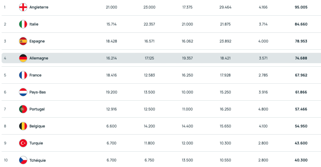 Alors que les Allemands ont marqué plus de points UEFA lors de la saison 2024/2025 que la France (18,421 contre 17,928), voilà la Ligue 1 revenue à moins de 7 points de la Bundesliga au classement UEFA (6è,962 points contre 74,688 points), avec la possibilité de se rapprocher encore si les clubs allemands sont en difficultés. A condition bien sûr que le PSG, l’OM et Monaco en Ligue des Champions, mais aussi Lille, Nice et Lyon en Ligue Europa, fassent le plein de points. Le paradoxe, c’est qu’une saison européenne catastrophique des clubs français, peut aussi rapprocher la France de la 6ème place. Les Pays-Bas sont à moins de 6 points derrière et pourraient en profiter pour se rapprocher, ou, au pire, passer devant.