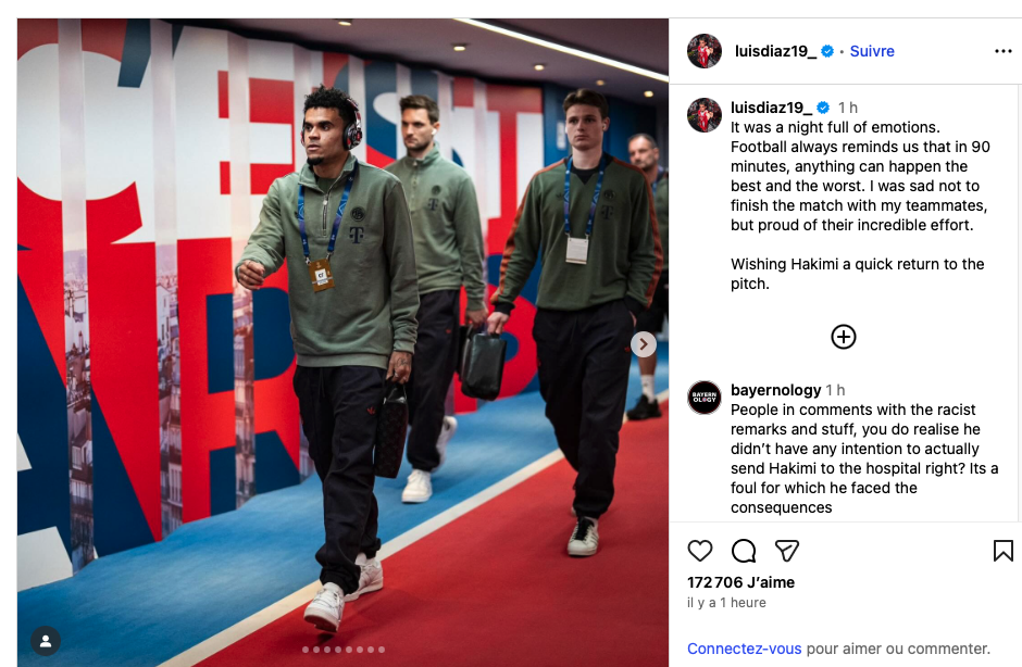 Dans son message, posté ce matin, Luis Diaz écrit : « Ce fut une soirée riche en émotions. Le football nous rappelle sans cesse qu’en 90 minutes, tout peut arriver, le meilleur comme le pire. J’étais triste de ne pas avoir terminé le match avec mes coéquipiers, mais fier de leur incroyable effort. » C’est seulement dans une dernière phrase ajoutée qu’il souhaite un « prompt rétablissement » à Achraf Hakimi.