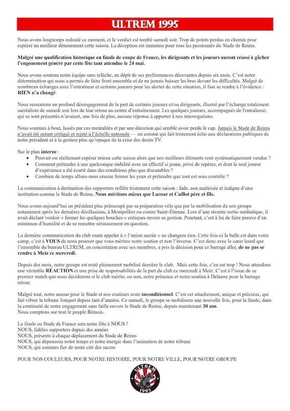 Les ULTREM s’en prennent directement à Jean-Pierre Caillot et son fils. « Nous méritons mieux que Lacour (ndlr : directeur général du Stade de Reims) et Caillot père et fils (ndlr : directeur sportif) ». En revanche, les supporters confirment bien leur présence au Stade de France, le 24 mai pour la finale de la Coupe de France. « Ce sera notre fête à nous » écrivent-ils.