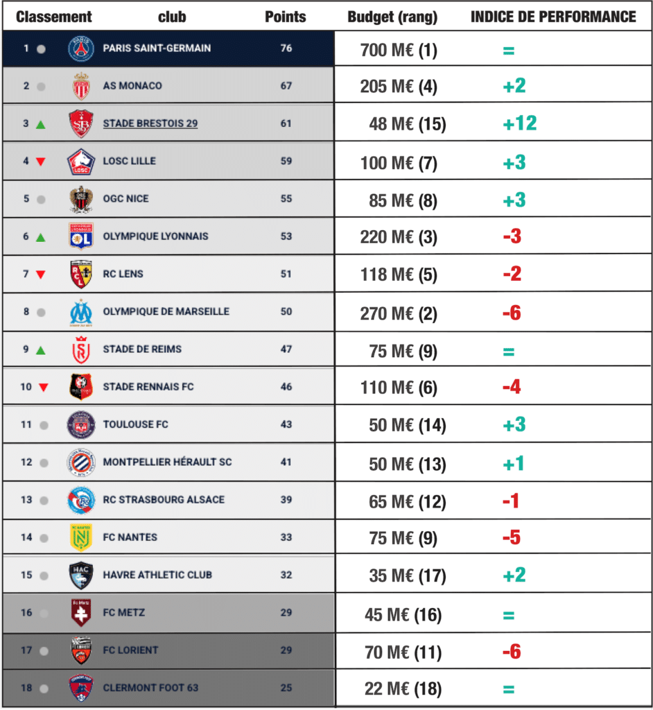 Si le premier (PSG) reste l’équipe au plus gros budget et que le dernier (Clermont), celle au plus petit budget, en revanche, entre les deux, ce que nous avons appelé « indice de performance » est très variable. En dehors des deux clubs cités, seuls le Stade de Reims (9ème) et le FC Metz (16ème) ont un classement à la hauteur de leur budget.