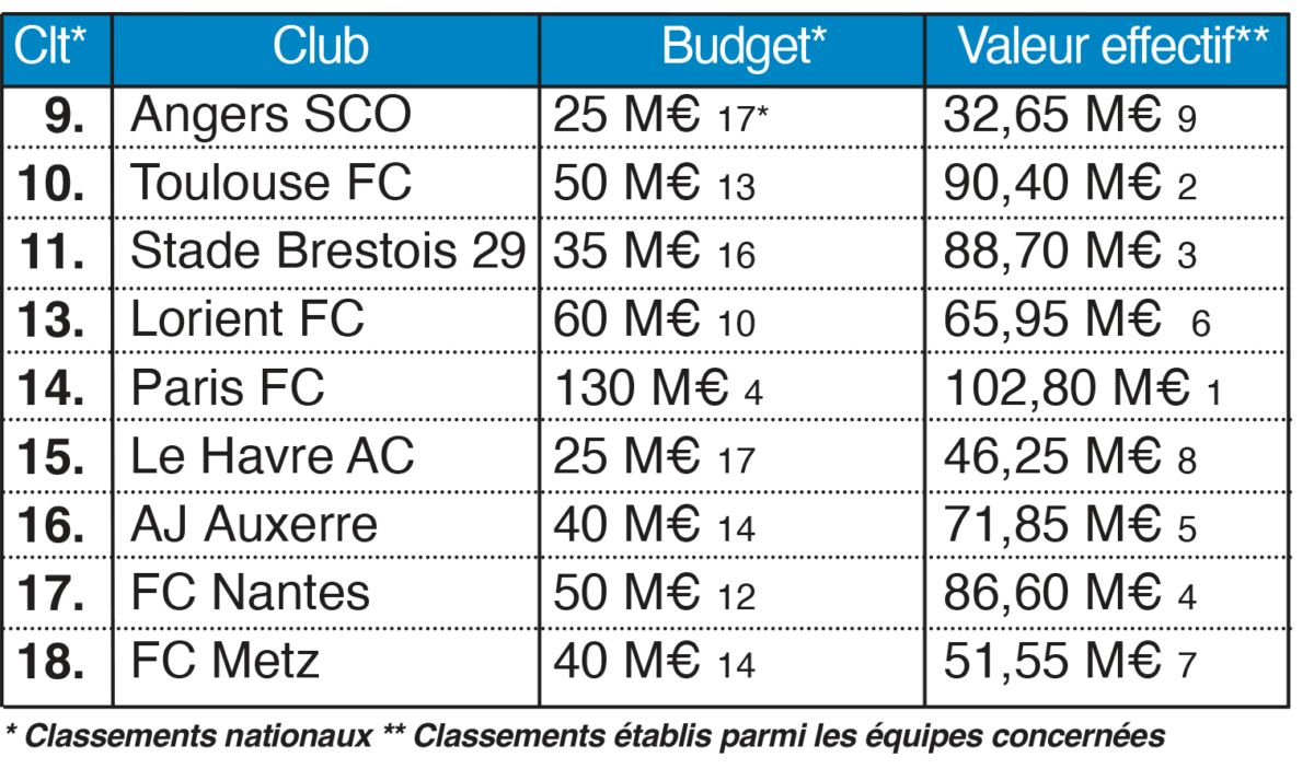Des joueurs comme Lepenant, la révélation Tati, le très suivi Abline, le prometteur Leroux, l’expérimenté Lopes (ou même Coquelin), l’international Mohamed ou l’espoir Guirassy (liste non exhaustive) feraient du bien à de nombreux clubs de Ligue 1. Certes, l’effectif ne parait pas très bien équilibré et manque de profondeur, mais de là à dire qu’il est moins bon sur le papier que ceux d’Angers, Le Havre, Metz, Lorient ou Brest… D’ailleurs, en terme de valeur de leur effectif, les Canaris rivalisent largement. Seul le Paris FC et Toulouse sont largement au dessus. Le groupe du Paris FC n’a pas plus d’individualités, mais parait surtout mieux équilibré.