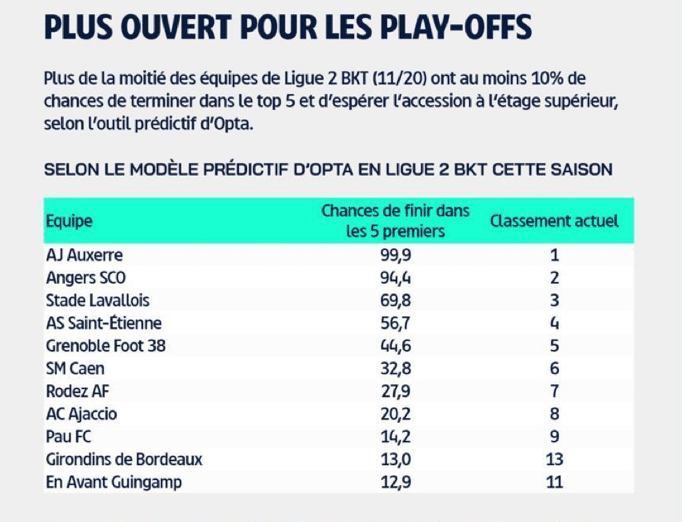Quels clubs ont le plus de chances de monter et quelques clubs sont les mieux placés pour jouer les barrages ? Hier, la LFP a publié une étude statistique de l’agence OPTA, spécialisée dans l’utilisation d’outils prédictifs, établissant les grands favoris de la course à la montée.