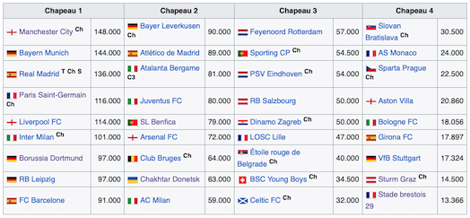 Une des modifications la plus importante, sans doute la moins mise en avant, c’est qu’il n’y a plus aucune équipe « protégées ». En effet, figurer dans le chapeau 1 ou dans le chapeau 4 (rappelons qu’il ya 4 chapeaux de 9 équipes), n’a aucune importance. En effet, chaque équipe affrontera deux équipes de chaque chapeau, y compris donc, son chapeau. Ce qui veut dire par exemple que le PSG (qui figure dans le chapeau 1) peut affronter le Real Madrid et Manchester City.