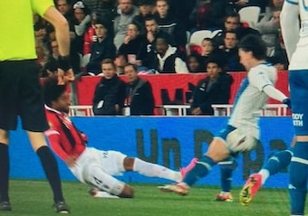 Entré en jeu quelque minutes plus tôt, le jeune monégasque Akliouche évite deux joueurs niçois dans la surface et perd ses appuis, suite à un tirage de maillot par Perraud. M. Watellier ne siffle pas.