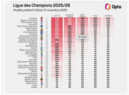 Les prédictions d’OPTA à mi-parcours