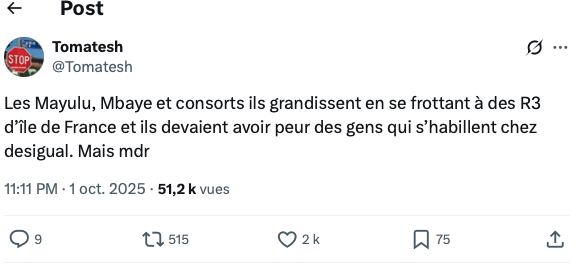 Un sentiment partagé par ce supporters du PSG sur les réseaux sociaux, après le match du PSG à Barcelone. « Les Mayulu, Mbaye et consorts ils grandissent en se frottant à des R3 d’Île-de-France et ils devaient avoir peur des gens qui s’habillent chez desigual. Mais mdr »