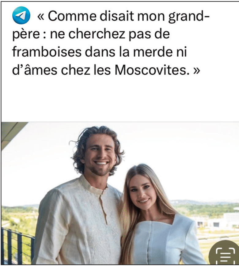 Pour rappel, dans une story Instagram, avant le match entre le PSG et Rennes, pour lequel Matvey Safonov était titulaire (Lucas Chevalier étant forfait), Angeline, l’épouse d’Illia Zabarnyi a publié un message sur son canal privé Telegram. On y voit une photo d’elle dans les bras de son mari, avec ce message : « Comme disait mon grand-père, ne cherchez pas de framboises dans la merde, ni d’âmes chez les Moscovites ».