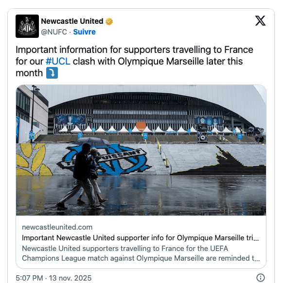 Faire peur à des Anglais, il faut le faire ! 11 jours avant le match décisif entre l’OM et Newcastle, le club anglais tremble. Pas sportivement (les Anglais sont 6èmes après avoir gagné 3 de leurs 4 matchs), mais pour la sécurité de ses supporters. Les canaux officiels du club du Nord de l’Angleterre multiplie ainsi les mises en garde, décrivant une ville hostile, où il faut « se méfier de la délinquance de rue ».