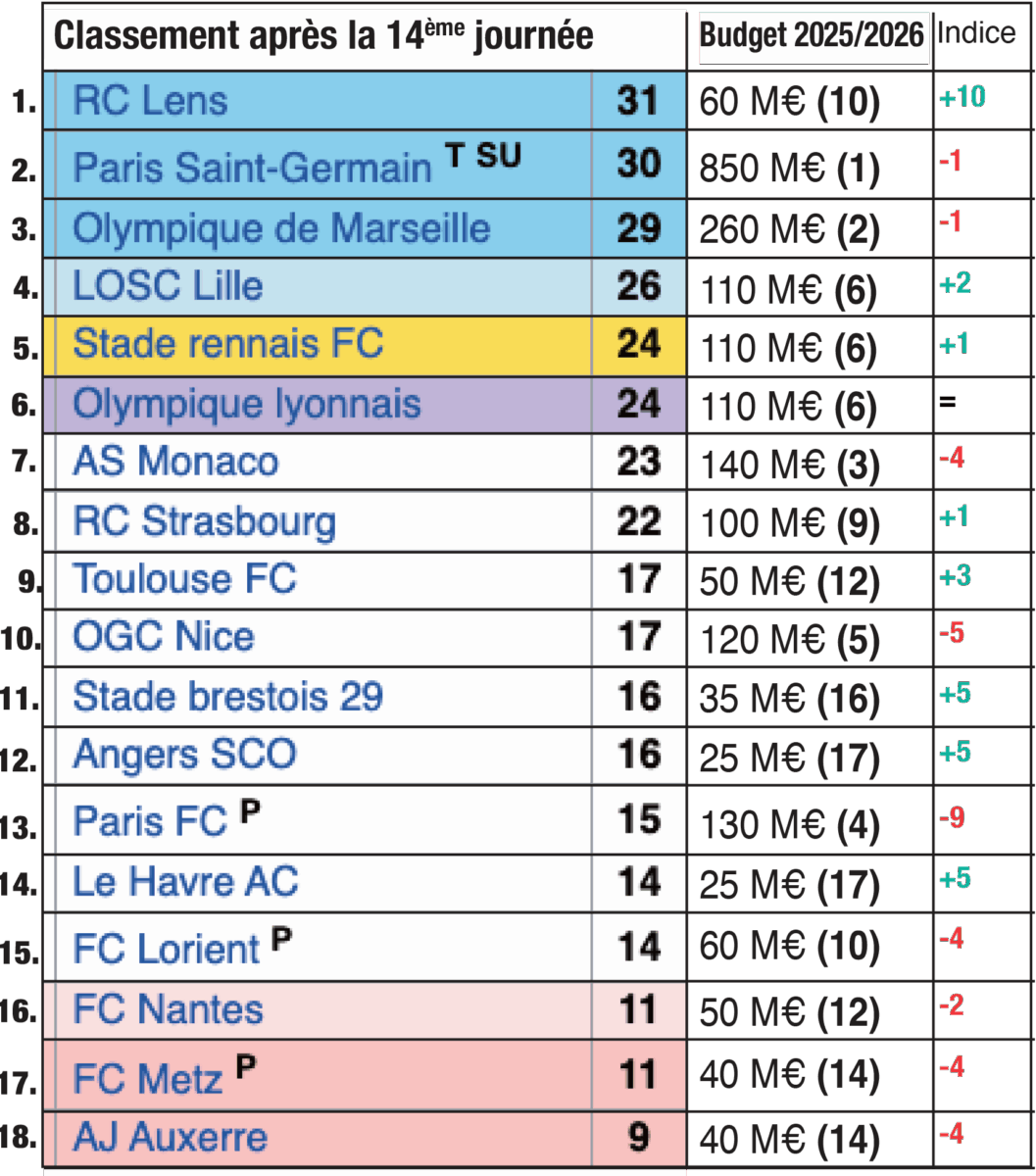 Seulement deuxième de Ligue 1 alors qu’il dispose d’un budget très largement supérieur à ses adversaires, le PSG est clairement en sous-régime dans ce premier tiers de championnat. Mais le club de la capitale n’est pas le seul. D’autres, comme l’OGC Nice, 10ème au classement malgré le 5ème budget de la Ligue 1, déçoivent, alors que le leader Lensois est sans aucun doute la plus belle surprise du championnat. Les Sang et Or sont en tête, malgré le 10ème budget de L1, très très loin derrière le PSG, mais aussi deux fois moins important que celui du Paris FC. Le 2ème club de la capitale est d’ailleurs celui qui a l’indice le plus faible. 4ème budget de Ligue 1, les Parisiens sont 13èmes.