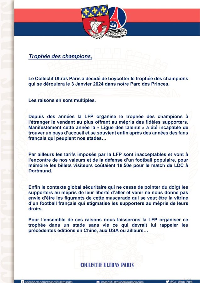 Une mascarade que le Collectif Ultras Paris a décidé de boycotter, comme il vient de l’annoncer par un communiqué. « Nous n’avons pas envie d’être les figurants de cette mascarade qui se veut être la vitrine du football français », peut-on lire. Voir ci-dessous le communiqué.