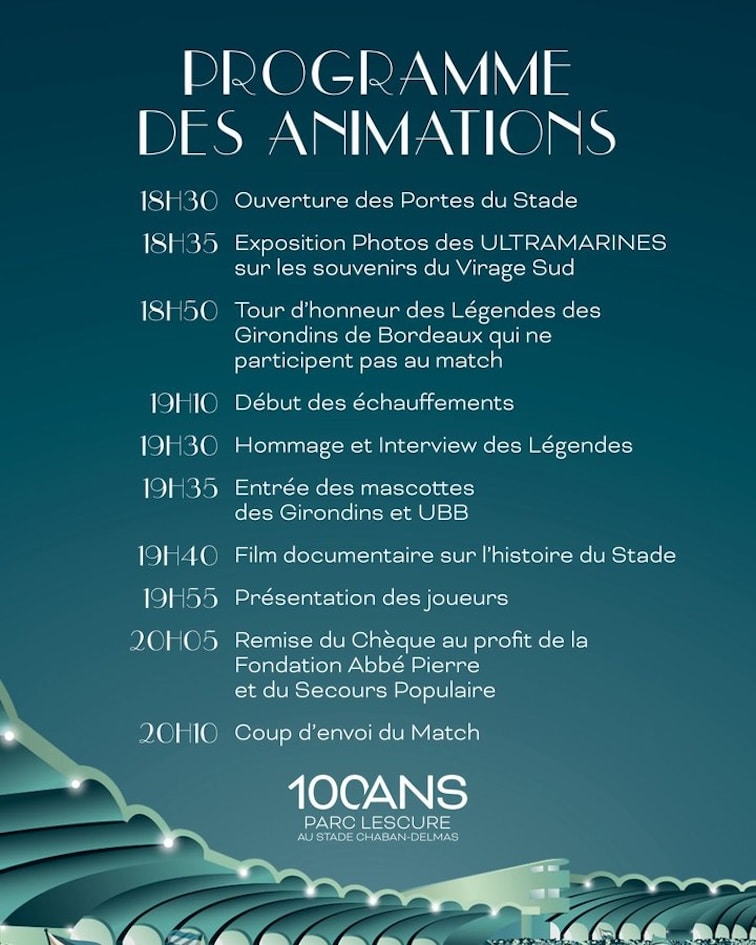 À lireEnorme coup de froid pour le transfert d’Endrick à l’OL !Un match organisé par trois entités : les Girondins de Bordeaux, la mairie de Bordeaux et le Variétés Club de France, sous l’égide d’Alain Giresse, né en Gironde, formé aux Girondins et qui a porté les couleurs du club pendant 16 ans. Les bénéfices du match seront reversés au Secours Populaire et à la Fondation Abbé Pierre. Le programme des festivités ci-dessous.